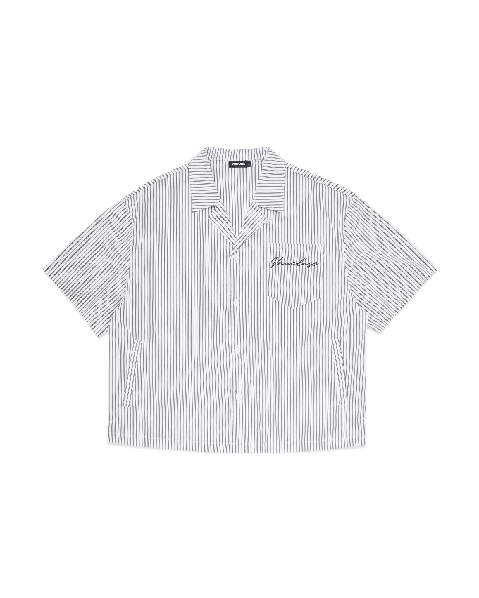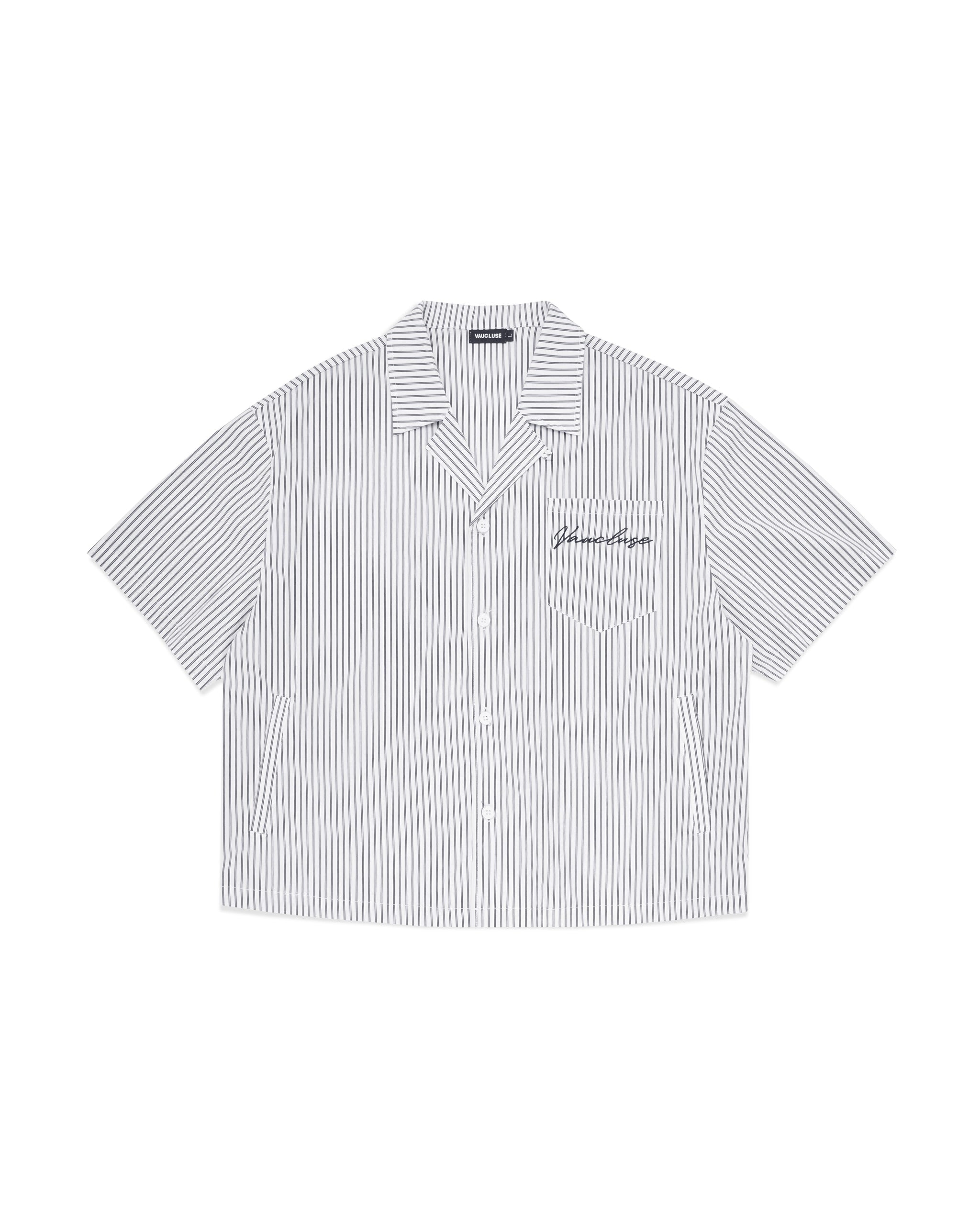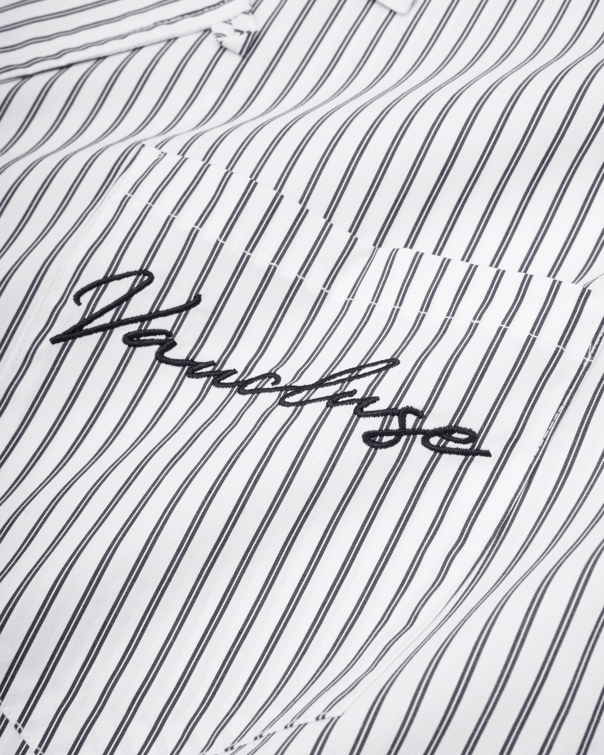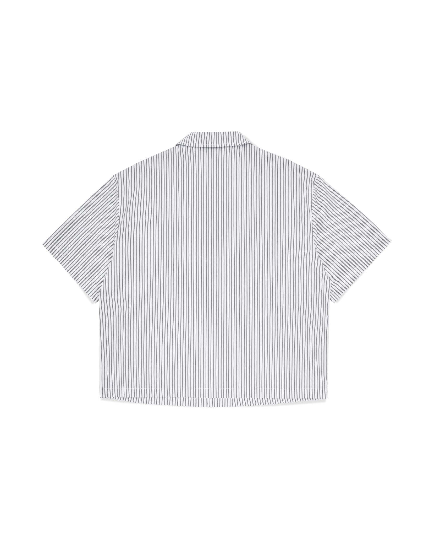 Introducing the Striped Signature Short Sleeve Shirt in White for SS25. The shirt features one chest pocket with our signature logo embroidered into the upper left side. Cut to our signature refined boxy, slightly cropped fit making our short sleeve an outerwear essential.